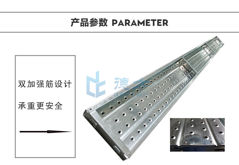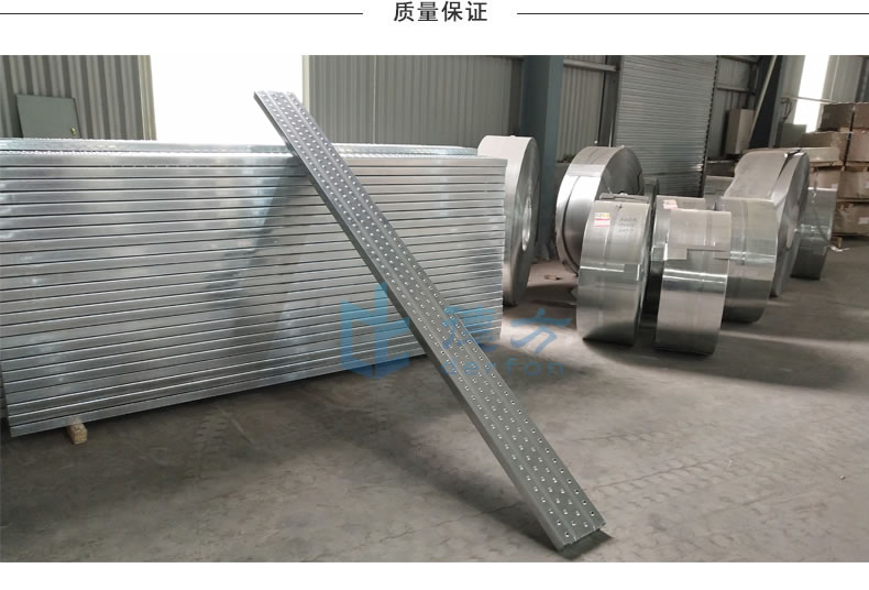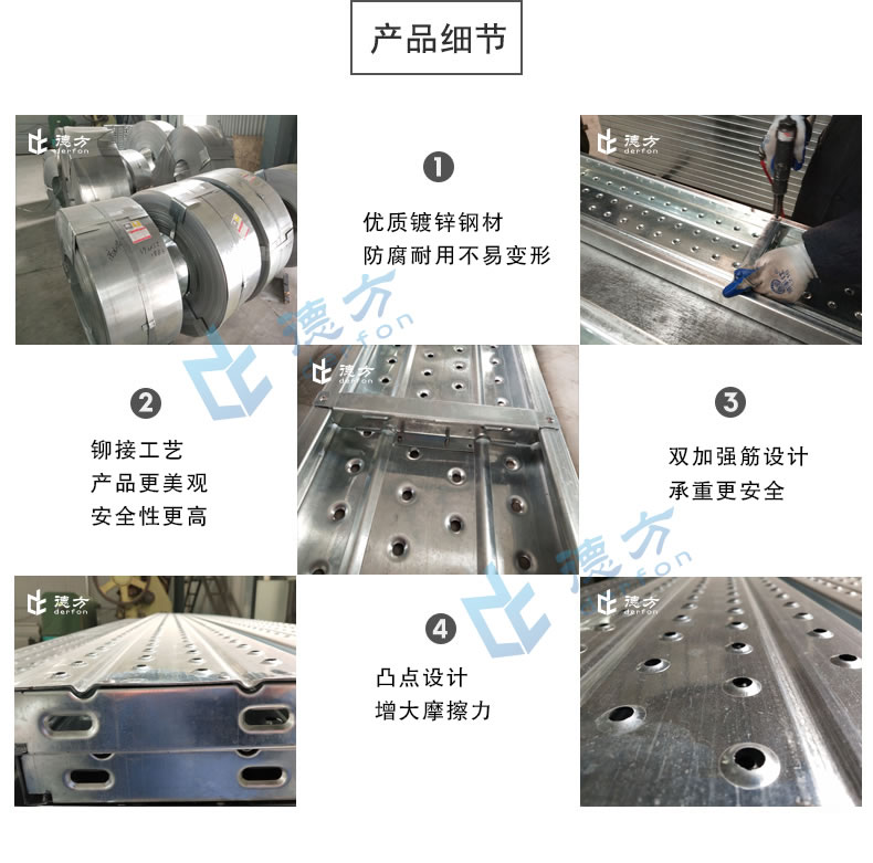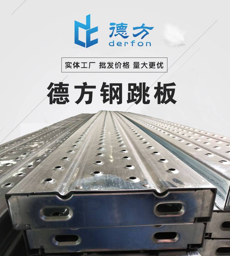 钢跳板是建筑行业施工用具的一种。一般可以称为钢制脚手板,建筑钢跳板,钢踏板,镀锌钢跳板,热镀锌钢踏板,深受广大造船业,石油平台、电力、建筑业的被推广使用。钢跳板开有M18螺栓孔,用于板与板连接,调节平台底部宽度。钢跳板与钢跳板之间,使用高度为180mm踢脚板,踢脚板涂黑黄相间的油漆,在各自的3个孔洞中用螺丝固定踢脚板。这样钢跳板与钢跳板之间就可固定连接了。连接完成后,应严格对制作平台的材料进行验收把关,平台制作完成后,进行试验。安装完成,经验收合格挂牌,方可投入使用。